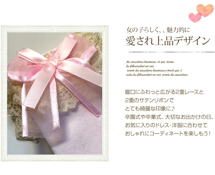 商品説明 サテンリボン&オーガンジーリボンの2つ重ねのリボンに、 生成りのトーションレースも2段がさねに飾った、華やかでかわいらしいソックス。