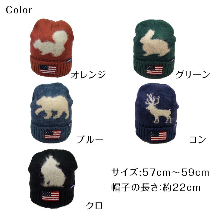 オレンジは『アカリス』 グリーンは『カンジキウサギ』 ブルーは『グリズリー』 コンは『カリブ』 クロは『コヨーテ』 帽子のカラーとアニマルの組み合わせをお楽しみ下さい。